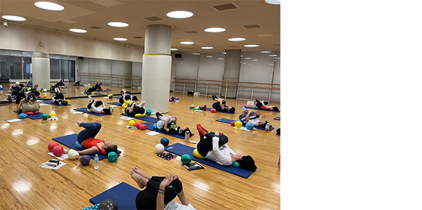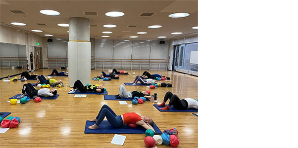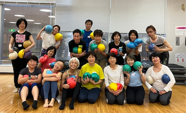 ボールの弾力が関節包や周りの組織をゆるめ、関節面の動きをなめらかにします。空気圧を変えてボールの弾力を変換すると驚くほど刺激が変わります。その変化が今まで経験したことがない心地よい感覚に導きます。エクササイズのルーティンも含めボールの空気圧と配置の変換で身体は多彩な感覚に次々に浸っていきます。それに連れて皆さんの可動性も増していくのがわかりました。