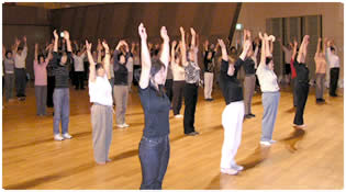 会場にどぉーっと押しかけてこられる勢いありすぎ?の参加者に、 メタボリックシンドロームなど無縁なのでは? と思わされます。 「いったるでー! やったるでー!」 私はこの大阪独特の気風が大好きです。 (2)エクササイズ(参加者 約300名)