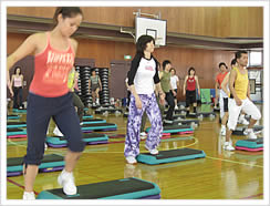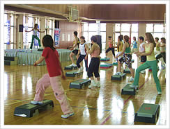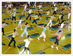 背後のバスケットゴールが、体育館らしさを醸し出しています。今回のイベントでは一番広い会場です。満員御礼の受講者達がステップ台を並べても、余裕のスペース!