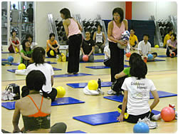 このスポーツクラスはボールの上を思わぬアプローチから転がったりします。