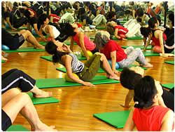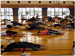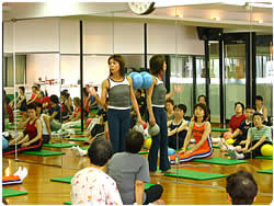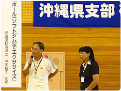 長寿の国として知られた筈の沖縄でも、最近「メタボリック・シンドローム」が深刻な問題となっているそうです。このボールエクササイズは、日々、沖縄県民の健康づくりを指導している方々のスキルアップ研修会として開催されました。沖縄国際大学の広くて綺麗な体育館に、約100名の健康運動指導士さんが集いました。