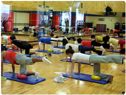 【左上】 ウオーミングアップは、「きつい!」と噂のコア・トレーニング 噂に違わぬ厳しさでした