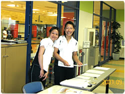 【右上】 明治乳業九州支店・沖縄担当の友利久仁子さんは、学生さん達の良きお姉様。