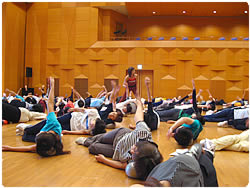 広いホールいっぱいの参加者の一人一人が、ていねいに自分の体と向き合います。