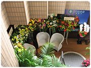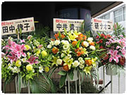 ■↓インセア*花盛り スタジオはB1F。開店お祝いのお花が、ビル周りの歩道、地下へ続く螺旋階段、吹き抜けのテラスいちめんに溢れていました。特に歩道と入り口には芸能人の方々からのお花が並び、道行く人は「何事か」と足を止め、興味深げに螺旋階段を覗き込んでいました。
