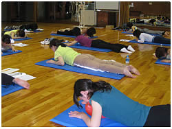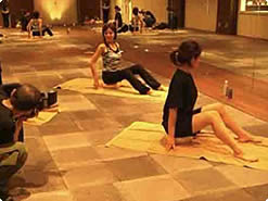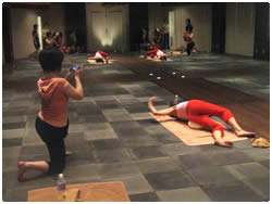 ■↓体験レッスンの様子 溶岩スタジオの内部は、さほど「暑」くはありませんが、寝ころんで、軽く身体を揺さぶるだけでも凄い汗が出ます。心と体の緊張がジワリとほぐれる汗です。この安らぎと充実感を説明できる言葉が見つからないのがもどかしいです。