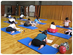 【右上】エアロビクスが初めての方も多く、まずは呼吸練習と姿勢の作り方からスタート