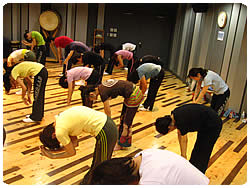 【右上】ヒノキの床のスタジオに、続々と参加者が集まります。