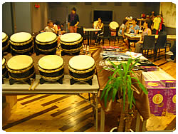【右上】会員さんが集うロビー。手前に並ぶのは売り物のしめ太鼓です。