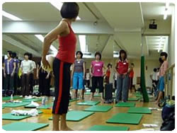 【右上・花井智子氏撮影】「さあ、リラックスして・・・ストレッチは、縮んだ筋肉の力を抜いて、筋肉を本来の長さに戻してあげることです・・・ 緊張せずに・・・抜いて・・・」