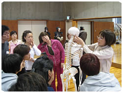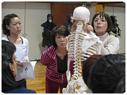 【右上】背骨一つ一つが動くイメージを、自分の背中と手を使って伝える中尾先生。