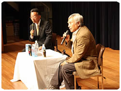【左上】司会の深山計さんと三浦雄一郎さんの対談形式講演