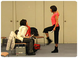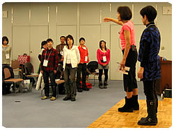 【右上】二人組でのドリルを説明。壇上のモデルは四方千代美インストラクター。