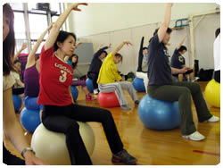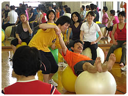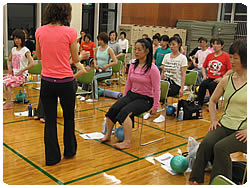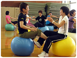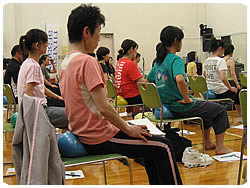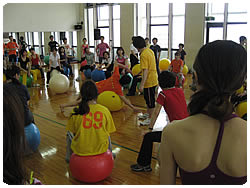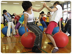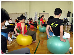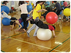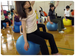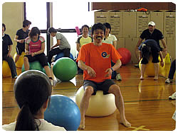 終盤では、ボールに体をあずけ、今使った筋肉を延ばしてリラックス・・・・ <後半担当:長谷川聖修先生> 回転するボールに座り、アンバランスな状態を遊ぼう スイスには、椅子のかわりにGボールを採用している小学校があるそうです。