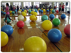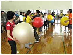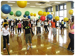 終盤近く 一斉に宙を舞う大きなGボールの美しさに思わず見とれてしまいました。 それにしても長谷川先生のお話は面白すぎです。会場は爆笑の渦でした。 「シンクルナイズドGボール」および「虹とボール」に関するご質問や資料請求は、