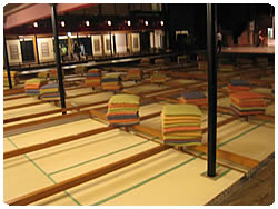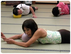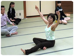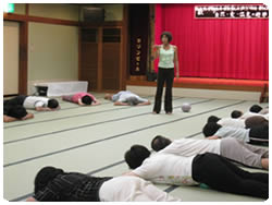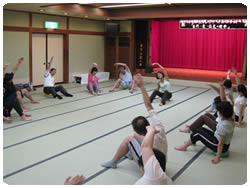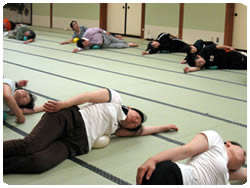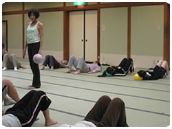 会場はなんと宴会場!柔道場の畳と違い、生活に即した畳の部屋での運動は、なんと和むことでしょう!畳のぬくもりを感じながら、どこでもねっころがれる自由と心地よさを味わいました。