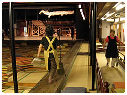 舞台が終わって:座布団を上げて、ほうきで桟敷を掃く、これも昔ながらの風景?