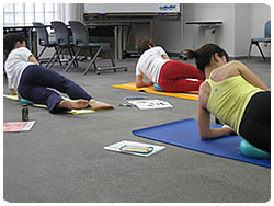 このセミナーではボールエクササイズの特性・ポジション・バリエーションなど、指導内容を決定するさまざまな構成要素を学びます。指導が調理とすれば、どれだけ沢山の材料があるのかを学び、その調理方法を習得していくことになります。JSAを考慮したエクササイズの展開は、すべての対象者に適応できて、また、幅広く利用できることを実感してもらいました。