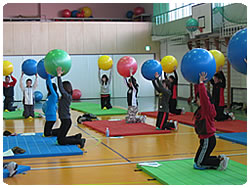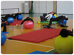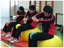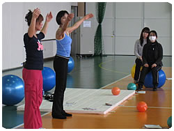 雪景色の名古屋でした。暖房をがんがん利かせても広い体育館ではどんどん冷え込んできます。その寒さを感じないくらい、ボールエクササイズに皆でしっかり集中しました。