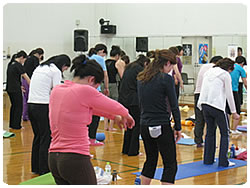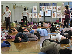 VAAMの強力なサポートで、90分を目いっぱいに動きました。 5月5日 15:30〜18:30 4年前から台湾に行って学んでいるBMCを何とかフィットネスと融合させたい、その想いが実現しました。吉田美和子さんは日本でただひとりのBMCプラクティショナーです。彼女と台湾で出会って以来、さらにBMCを学ぶチャンスに恵まれ、筋骨だけの身体感覚から、そこに、体液が流れ、内臓が埋まり、豊かな身体感覚が育まれました。ですから私の動き自体もずいぶん変化しました。この心地よさ、豊かさを何とか伝えたいと必死でがんばりました。