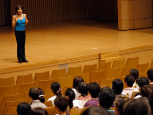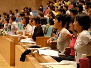 全国のスポーツ指導者、保育士や学校の先生ほか教育関係の方々が参加されているこの夏期講座、午前中の講演はカルチャー棟の大ホールで、約430名の参加で行なわれました。