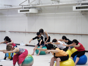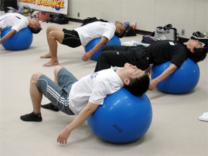 ボールを脚の間にはさむのか、手に持って持ち上げるのか、ボールの位置でエクササイズが変わります。身体のポジションだけではない、ボールのポジションを学びます