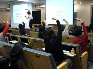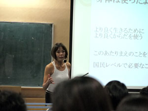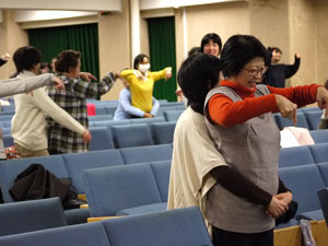 今回の会場は残念ながらボールでのエクササイズはできませんでしたが、座席に座りながら、またはその場での立位で、呼吸運動や肩甲骨をすべらせる動作、背骨を元気にする運動などを行ないました。