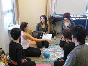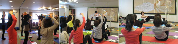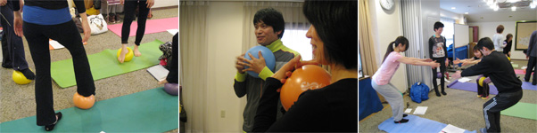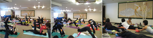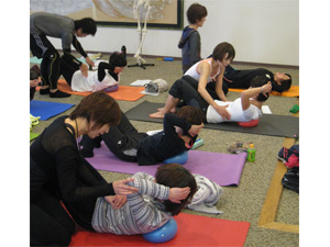 身体の位置もボールの位置もさまざまでしょう?どの要素を変換すれば、エクササイズがどんなふうに変わるのか、とにかく、無限にあるエクササイズバリエーションを順序立てて、頭で整理しながら身体で体験します。