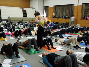 130名を超える参加があり、宮崎県のフィットネスインストラクター仲間とも再会できた、うれしい、うれしい一日でした!今回は鹿児島県の井上由香里と大分県の田崎三穂インストラクターにアシスタントをお願いしました。JSAはとくにボディマッピングを正確にしないと効果半減です。大人数になるほど助っ人が必要です。前日から三人で濃厚な打ち合わせをして、そして、いっぱい食べて飲んで、講習会にのぞみました。