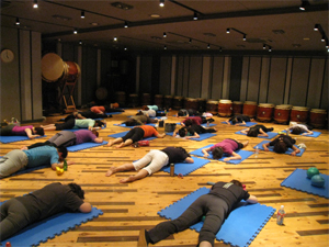 JSAボールエクササイズは美しい姿勢と動きを追求していくので太鼓演奏のためにも非常に役立ちます。私も皆さんと一緒にえらく集中していたので、うっかり写真を取るのを忘れました。かろうじて2枚、皆さんが気持ちよく力が抜けてきたときのショットです。