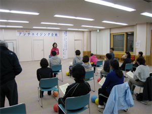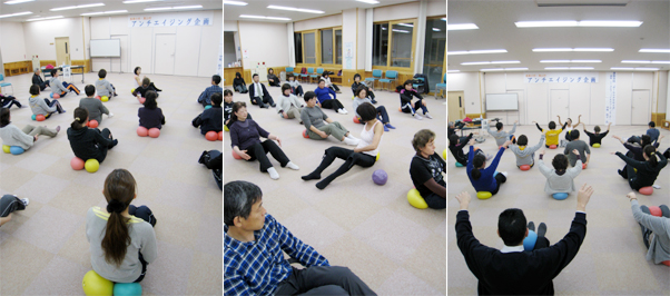 20名限定のJSAボールエクササイズは床暖房の快適な部屋が用意されていました。そして、役場の職員の方たちも参加してくださいました。「心地よさを重ねる練習が運動です!」というところからスタート、「気持ちよさを探究すること」、そのために「自分の身体に意識を向けること」をていねいに繰り返しました。
