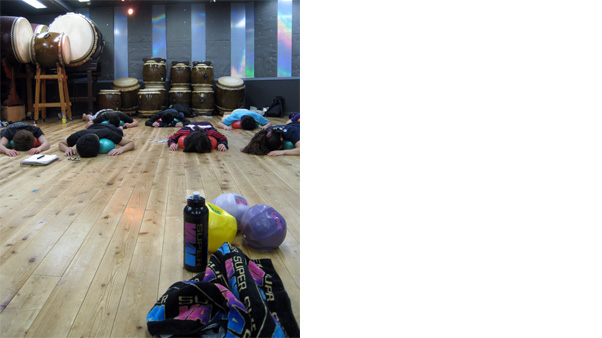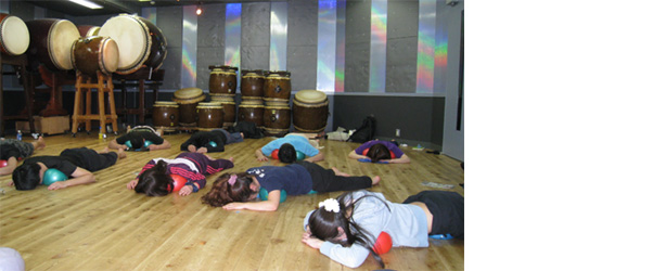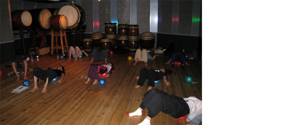 いつもは和太鼓が主役のスタジオにソフトギムニク(小さいボール)が学びのツールとして活躍します。フィットネスインストラクターと同じように身体を使って指導する和太鼓講師にとっては、やはり身体が資本です。指導力を上げるにもパフォーマンス能力を向上させるにも自分の身体をコントロールできることが重要です。