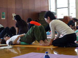 ペアになって「手あて」を練習。目を閉じて手に意識を集中したり、お互いに感覚を伝えあったり。