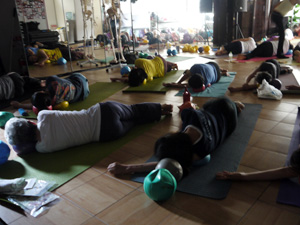 どうしたら力が抜けるか、みなさんがものすごく集中されているのが伝わってきます。JSAが初めての方もボールの上に身体をじょうずに預けていらっしゃって、すごい!と思いました。