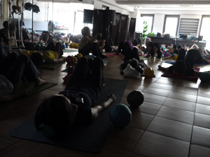 A、Bクラスとも満席でキャンセル待ちも出るほどで、「JSAは初めて」という一般の方がたくさん参加されました。会場のBTC (Bravo Training Center) の部屋いっぱいにヨガマットを敷きつめ、にぎやかなレッスンになりました。