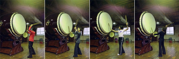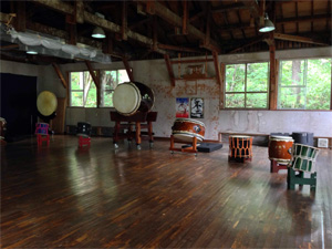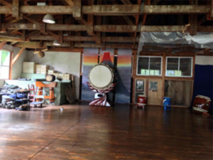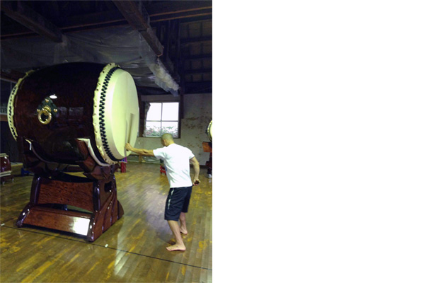 道場に着いたらすでに様々な和太鼓がセットしてあります。その中に、なにげに、あの不二(健作さん個人所有では世界最大)も並んで在りました。しかし、不二は圧倒されるようなものすごい存在感です!