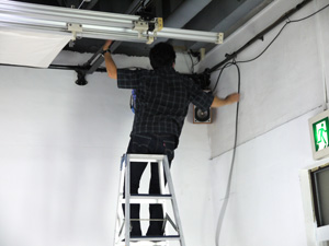 スタジオの天井にライトをつり下げてくれる隆ちゃんをコワゴワ見守ってます。脚立がすごーく高くて心配!