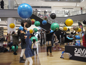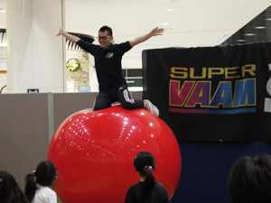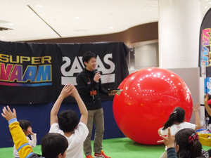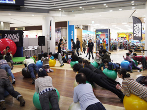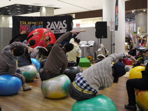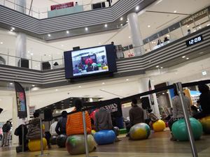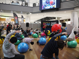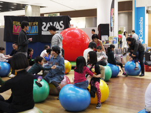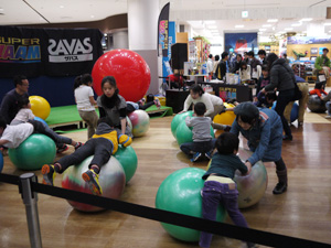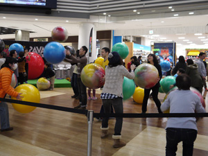 会場のアクティブモール。大きいGボールの奥には特大Gボールもスタンバイ。ここでのイベントのために、株式会社ギムニク様のご好意で、すべてご用意くださったものだそうです。いつもありがとうございます!