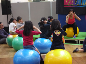 大きなGボールを使って、心地よい呼吸や美しい姿勢の整え方を体験。そのうちに身体も温まって、大人の方も子供たちも思いっきりの笑顔で楽しそう!