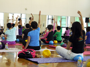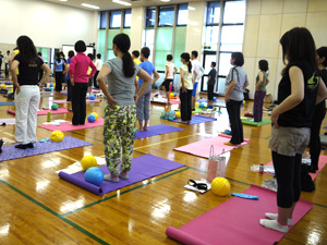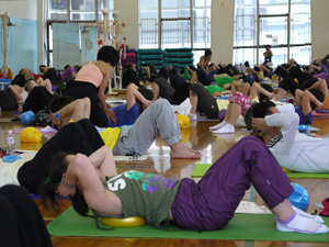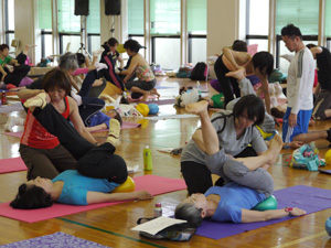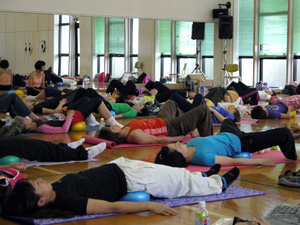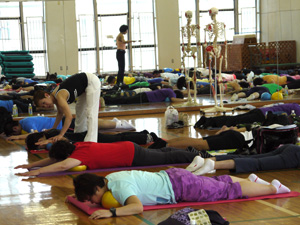 その後は早速JSA ボールエクササイズ。サポートされているのは、京都の中尾スクールでも中尾先生をずっとサポートされてい、るJSAトレーナーの四方千代美さん。