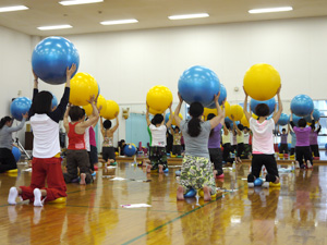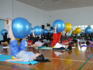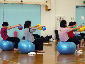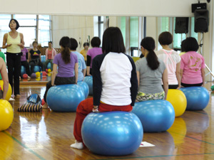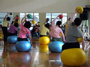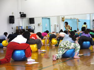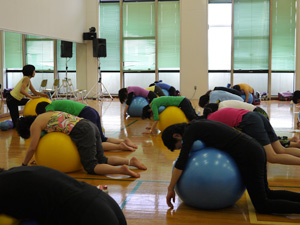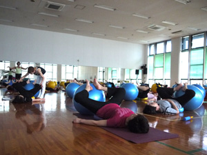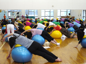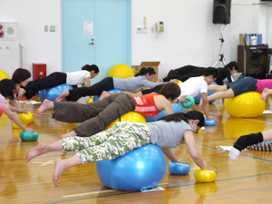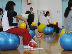 大きいボールにまっすぐに座るだけでも運動、両脇に小さいボールをはさんでいるだけでも運動。それらに始まり、様々なポジションで実技をこなしていかれました。