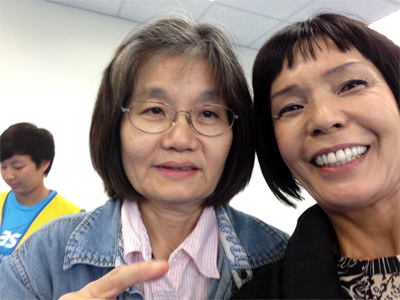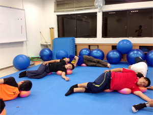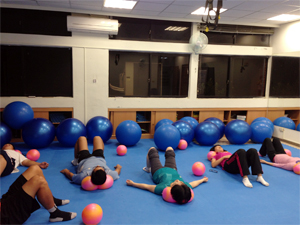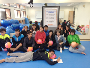 腰痛と偏頭痛もちの蔡先生にJSAボールエクササイズを説明し、腰仙・仙腸関節の実技をしたら、頭痛が消えたので、大変驚かれ、同時に大変興味を持ってもらえました。私のフィットネスの考え方にも共感してもらえたので、授業は呼吸や姿勢の大事さなど、私のやりたいことをそのままさせてもらえました。