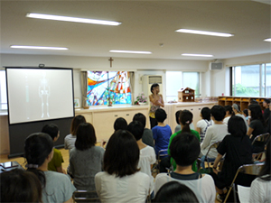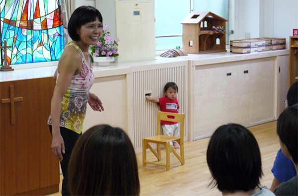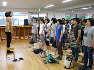 2回目のいづみ幼稚園での講演です。若いお母さん達に会うのがとても楽しみなのは、まるで自分の娘に接するような気分になるからでしょう。園児達は下の部屋で遊ぶのですが、まだ小さい何人かの赤ちゃんや子供はお母さんと一緒に参加です。だから、ほんとにお母さん達は大変なのです。時々ぐずったり、泣いてしまったりする子をあやしながら、こちらの話を聞いて、動いて、自分の身体を感じるのですから、さぞ、慌ただしいことでしょう。でも、さすが、子育てまっただ中のみなさんは、たくましい!平気に集中してくださいます。「すごい!」と思いました。