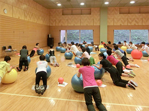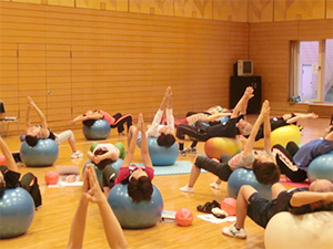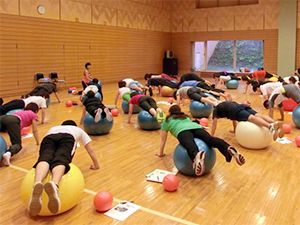 ほんとうにボールの威力はすごいといつも感じます。とくに指導者向けワークショップの時は強度と難易度のつくり方もやるので、非常に幅広いレベルで実技を体験します。マニュアルを見ながら(このとき印刷が間に合わずコピーの改訂版マニュアル使用)身体と向き合いしっかりボールエクササイズに取り組みました。皆さんの集中力はすごかったです!