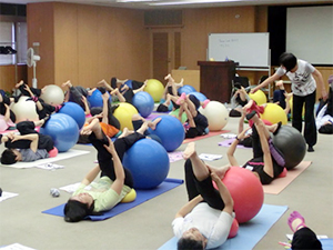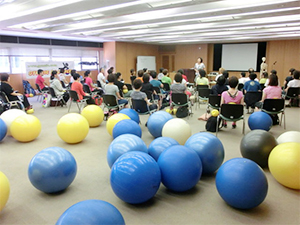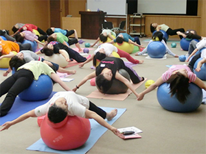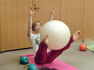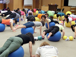 ボールの不安定さや弾力などをボールの上で転がりながら体感
