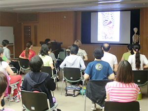 大変人気のあるワークショップなので10人もキャンセル待ちがでてしまいました。それだけにプレッシャーも大きい!解剖学の知識を指導の現場で役立つようにすることと、そして、なによりもこの講座の体験で身体感覚が変わることが大きな目的です。スライドを見ながら、机上ではなく、自身の身体をさわって骨、筋肉、内蔵の形状、位置など体感しました。