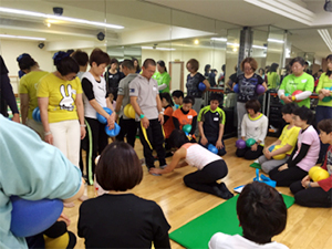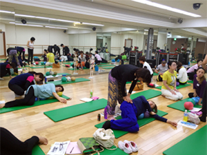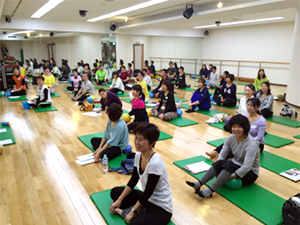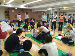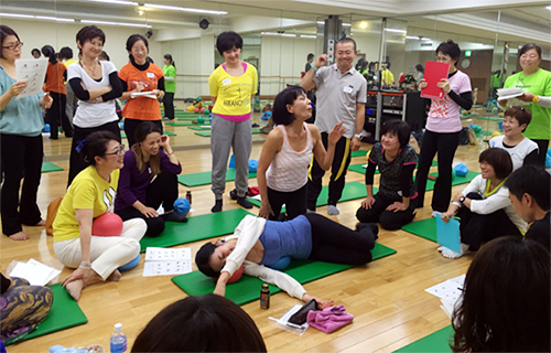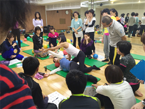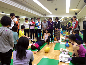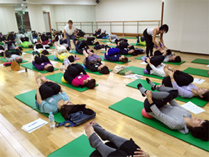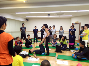 JSA認定インストラクターと全くJSAを経験したことがない人たちとの混合クラスでした。最新情報ではゆする・ふる・バウンスなど実技を通して体感してもらったので、初めての方もJSA基本エクササイズをしっかり経験できました。その後のハンズ・オンでは、ドリル形式でバンバン練習していきます。とにかく、集中したすごい集団がチャレンジしまくるので、楽しさがスタジオいっぱいに広がっていました。