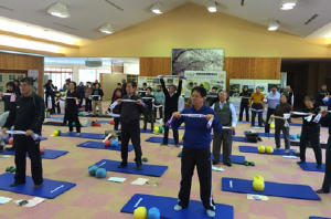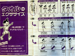 高山村村歌にあわせてタオルde体操!日本手ぬぐいに体操と歌詞が印刷されているので「わかりやすい!」高山村村歌が流れて「いっちにーさんしー!」