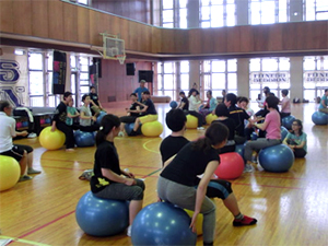 そして、ラストは長谷川先生から、自分との対話だけでなく、ボールがあるから「人とのつながり」を強く感じられる心地よさの体験です。ただ座るということも3人息を合わせて行うと面白さとともに気持ちよさが広がりました。