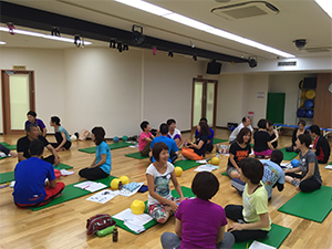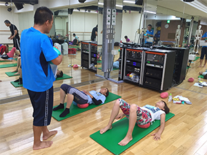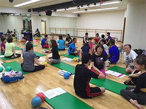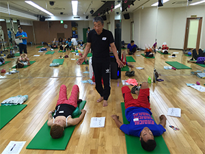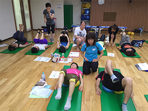 JSAボールエクササイズ養成コース3日目は指導技術を学びます。まず、指導者の発する言葉や一挙一動が指導に大きな影響を及ぼす事を確認しました。この自覚が高まるほど指導力は上がります。レッスン形式で実技を体験したあとは指導スキルのためのドリルをどんどんこなしていきました。